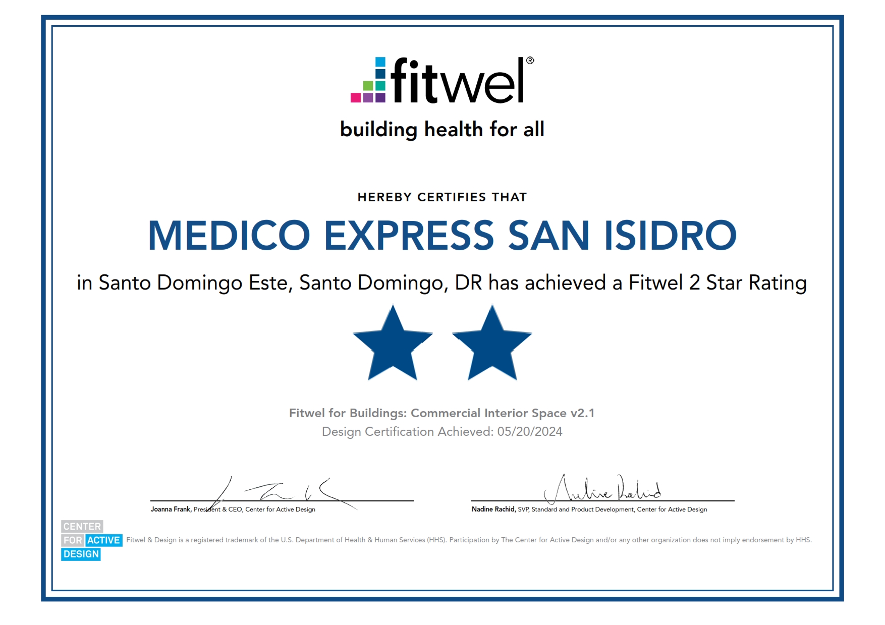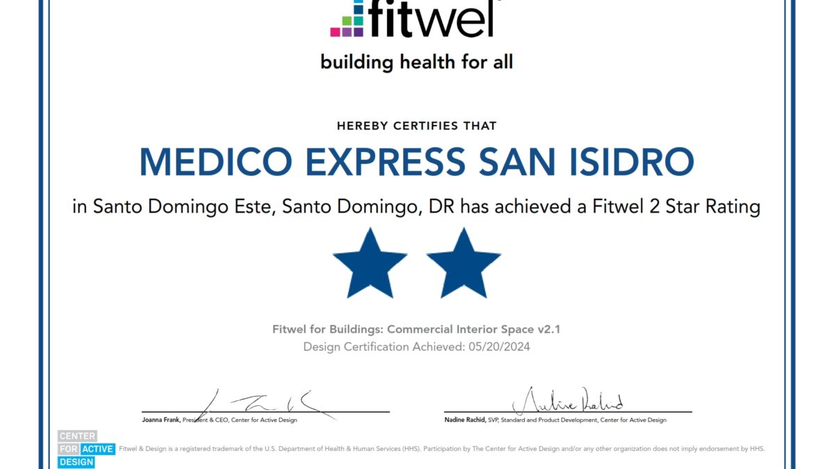 junio 4, 2024El centro de diseño Activo de NY, USA, luego de completar el proceso de evaluación que avala las estrategias y políticas de gestión, otorgó a Médico Express San Isidro la certificación de Fitwel con 2 estrellas, por diseñar un proyecto y flujos operativos que promueven la salud y el bienestar de sus colaboradores y pacientes.